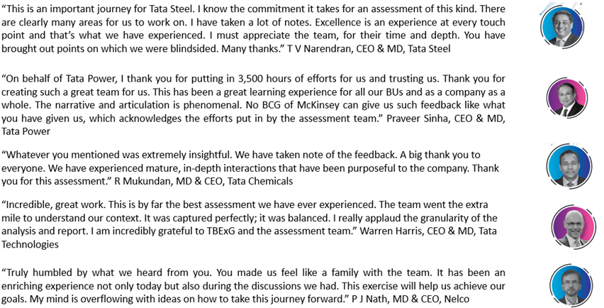 The Business Excellence Assessments, using the Tata Business Excellence Model (TBEM ) framework has been an integral part of organisational management practices in the Tata group. They have been quietly assisting the leadership in strengthening the strategic and operational capabilities of Tata companies since its inception. The inclusive nature of the model, with its multi-stakeholder focus, has been inspiring companies to move up in their journey of excellence.